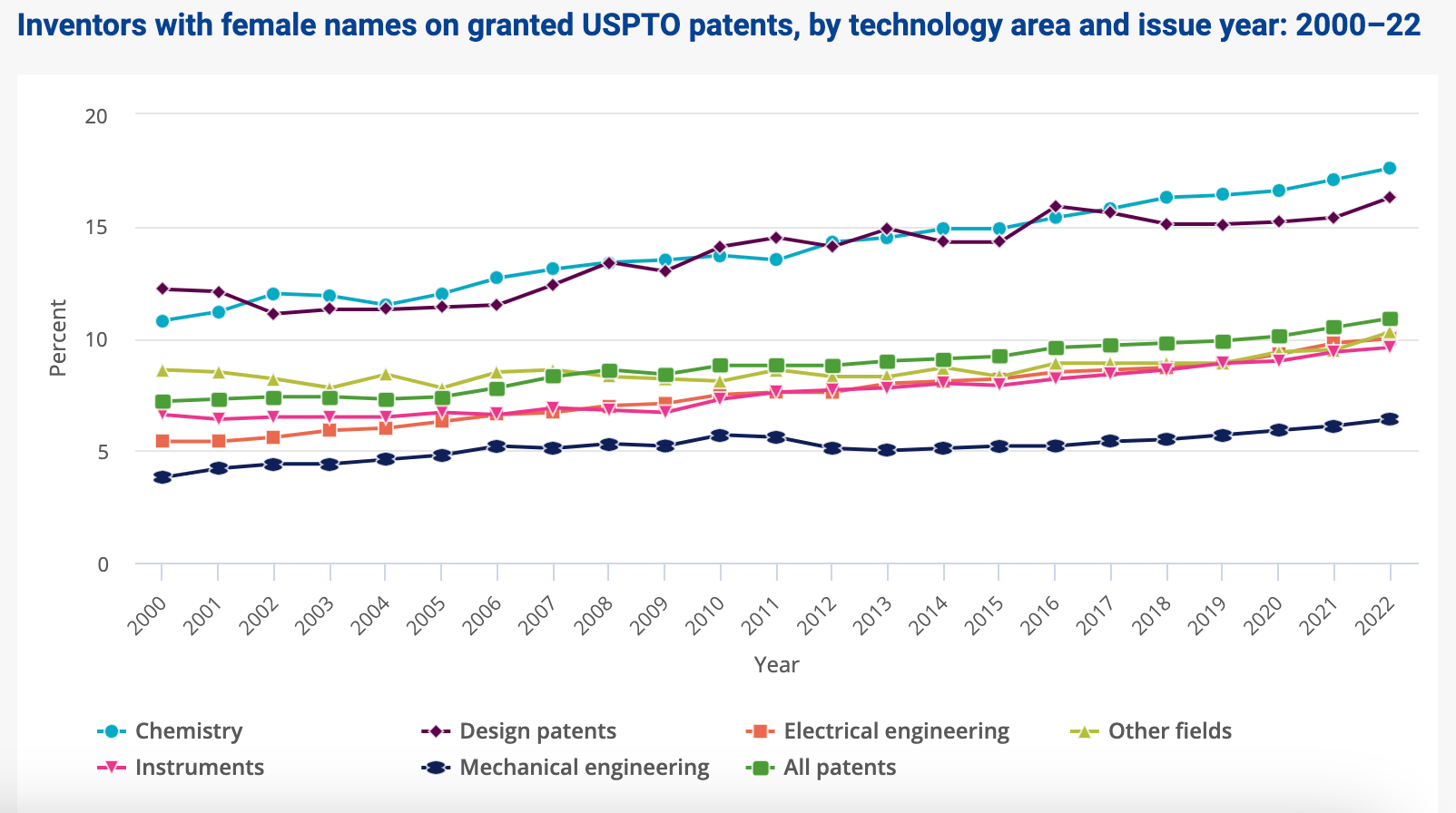 In 2022, 11% of all USPTO patents were granted to women, an increase from 7% in 2000. 16% of those patents were in design, 18% in chemistry, and 6% were in mechanical engineering in 2022.